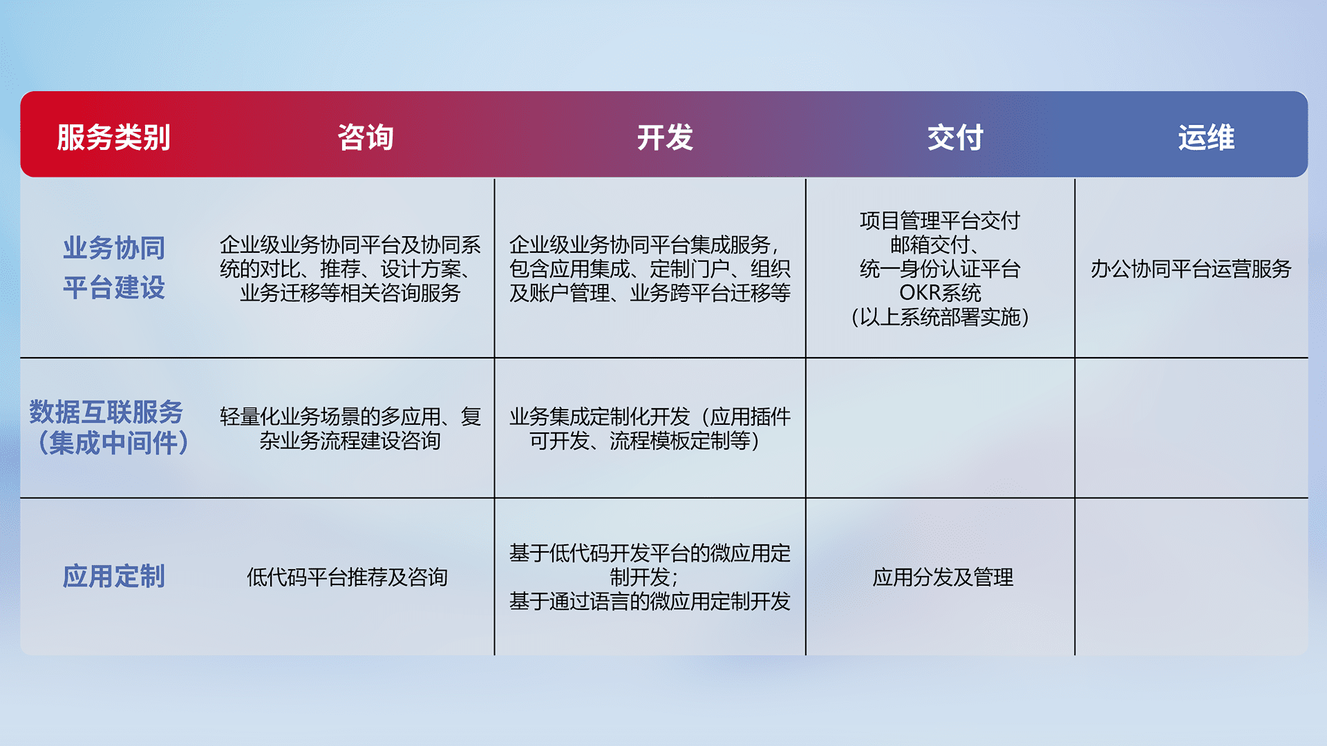 针对钉钉、、、、企微、、、IDaas等平台级产品提供产品的规划、、、、方案、、交付、、定制化开发等服务,,,,实现如统一协同办公、、、智能客户服务、、、混合会议管理、、、智能数据查询、、等业务场景,,,实现数字化转型。。。