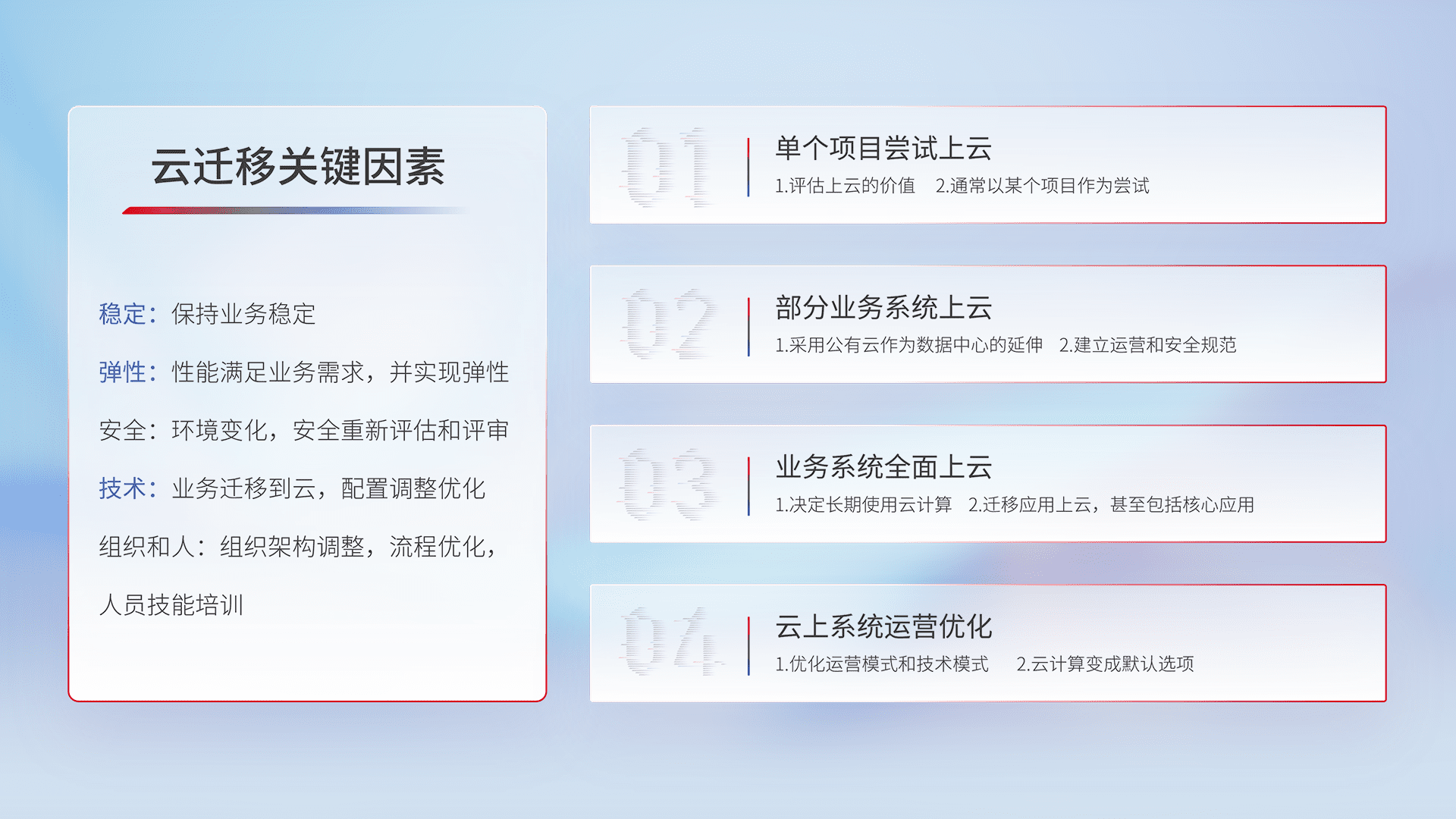 结合实际业务,,,,从规划设计、、、云平台选型、、、、云原生改造、、、数据迁移、、、集成交付,,迁移全过程为客户识别最佳上云路径,,,做好风险识别管理,,,,设计网络架构、、身份权限、、、、安全审计合规、、、、操作审计、、、、日志审计、、监控告警策略、、多站点容灾设计等,,对云上基础设施进行整体规划,,,提升IT治理水平,,,以满足弹性、、、高可用、、高性能的需求。。。