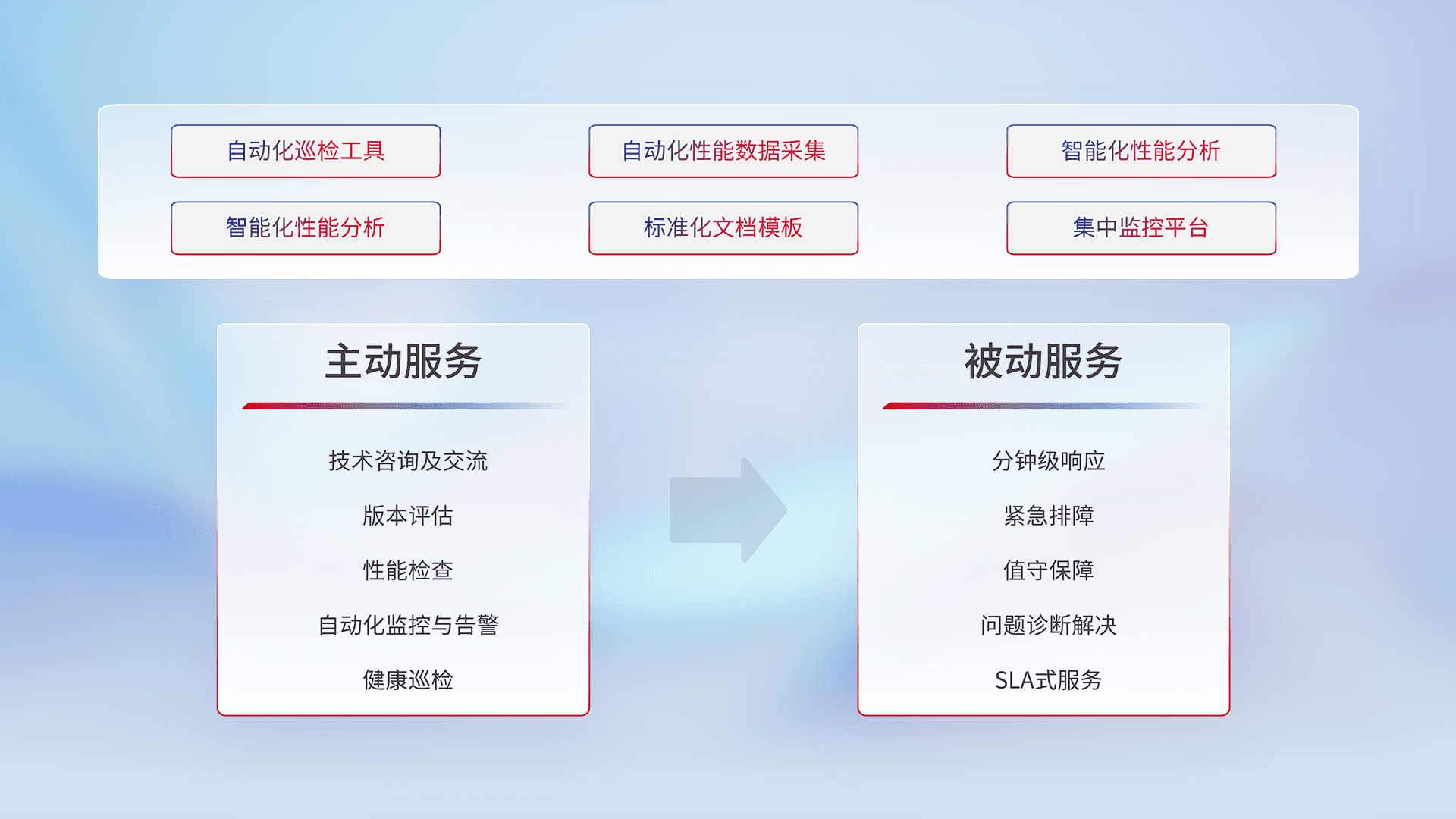 智能化工具和标准化文档,,保障服务质量,,提供主动服务(包含技术咨询、、版本评估、、、、性能检查、、、、自动化监控与告警、、、、健康巡检)和被动服务包含(分钟级响应、、紧急排障、、、值守保障、、、问题诊断解决、、、、SLA服务)。。。